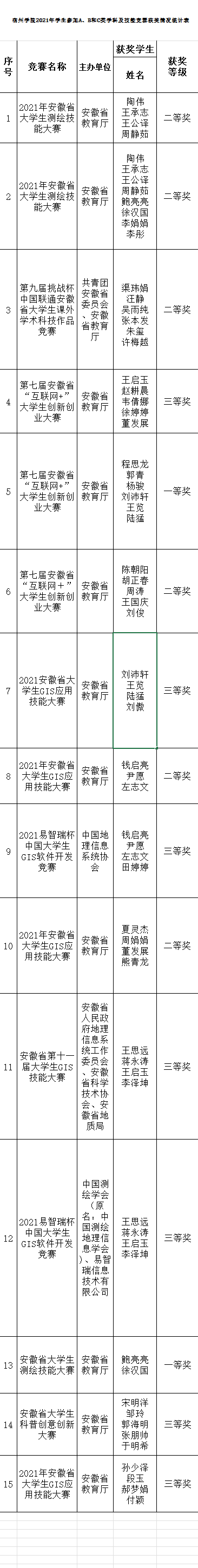 2021年学生参加A、B和C类学科及技能竞赛获奖情况